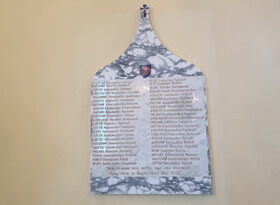 На момент нашего посещения, в храме уже находилась небольшая табличка – она была размещена неподалёку от креста и смотрелась композиция, прямо говоря, не лучшим образом. Надписи мелкие, практически не читаемые, да и сам мрамор, даже находясь в закрытом помещении, потускнел и утратил презентабельный вид.