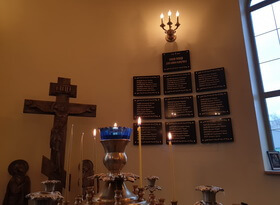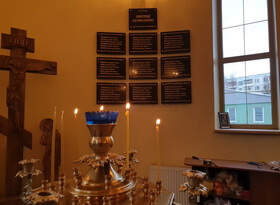На фотографиях ниже отображено состоянии стены памяти после завершения всех работ. Таблички висят в определённом порядке, надписи легко читаются даже при небольшом освещении, а общая цветовая гамма удачно вписывается в церковный интерьер.