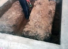 Исходное состояние:Стандартный ленточный фундамент по периметру участка, металлический крест и мраморная плита с надписью