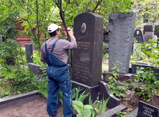 Практически сразу мы взялись за восстановление надписи: для этого её следовало покрыть специальным раствором. Перед тем, как приступить к надгробью, мы тщательно убрали на могиле: пропололи растущие у основания памятника цветы, а также убрали с территории участка весь мусор, который в последствие был вывезен с кладбища.